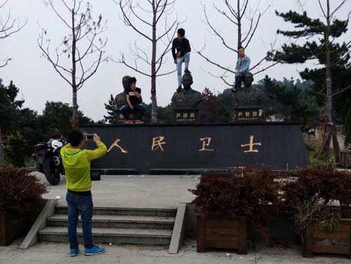 靠 左侧的穿短袖T恤的男子不仅坐在陈伟烈士铜像的头顶上,还将烈士的头夹在两腿之间;中间的黑色外套男一脚踏在尹进良烈士铜像的肩上,另一只脚直接踩在烈士 头顶摆起POSE;最右侧的牛仔上衣男则直接一屁股坐在尹智慧烈士的头顶上,跟另外两个同伴一起合影。这三人目测均为20岁左右,另有一名黄色外套的男子 在用白色手机给他们拍照。