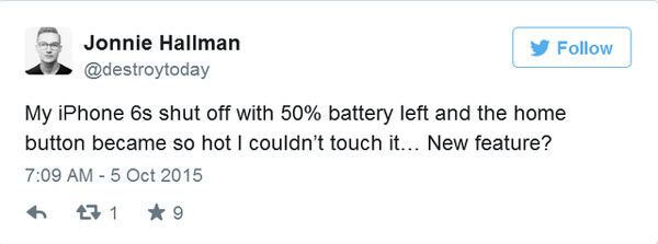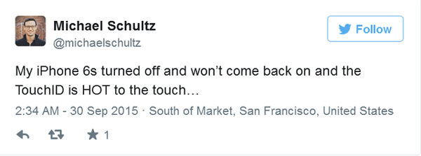 10月6日,据国外科技媒体《Mashable》报道,有iPhone6s用户在苹果支持论坛和Twitter上抱怨,TouchID按键发热严重,摸起来很烫。