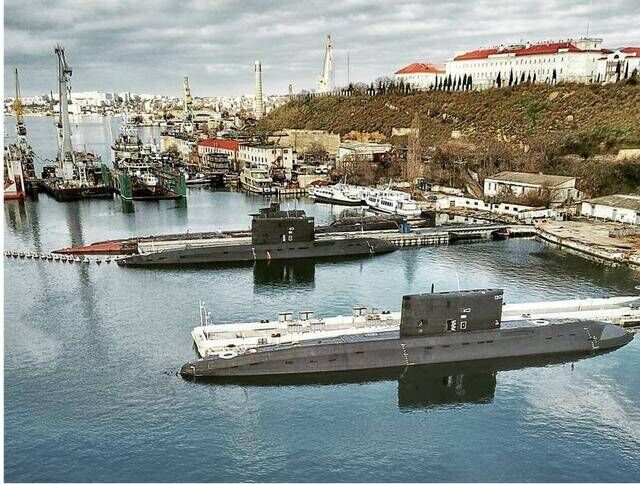 图为停泊在俄罗斯军港内的基洛级潜艇
