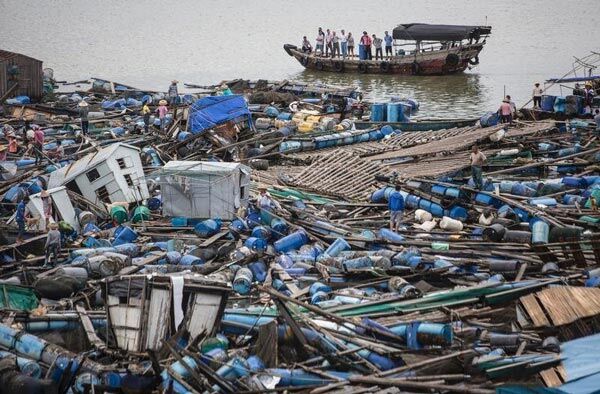 10月06日,广东省湛江市,在坡头区南三桥下,大量的渔排在台风中撞在一起,渔民损失惨重。