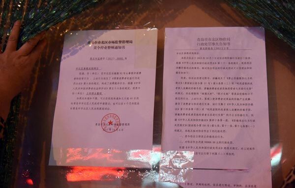 有关部门在宰客食店大门上张贴的处罚通知书。