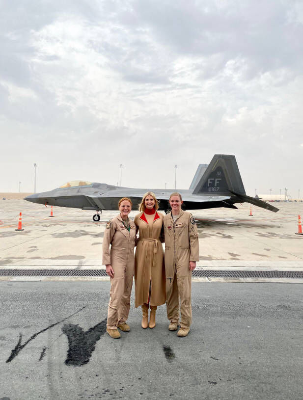伊万卡身穿驼色大衣,与女兵在战机前合影(推特)