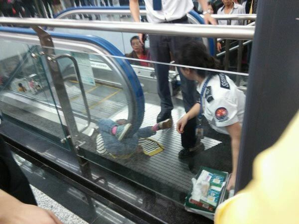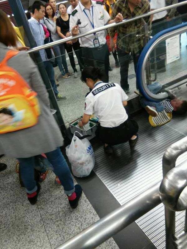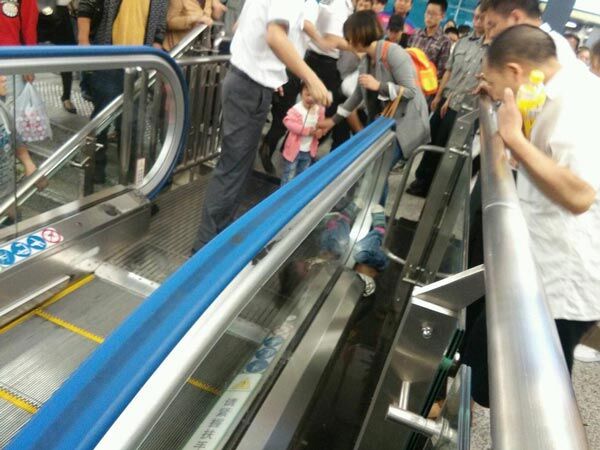 重庆红旗河沟轻轨站扶梯卡了一个小孩。孩子母亲和另一个孩子在哭。愿上帝眷顾这孩子。