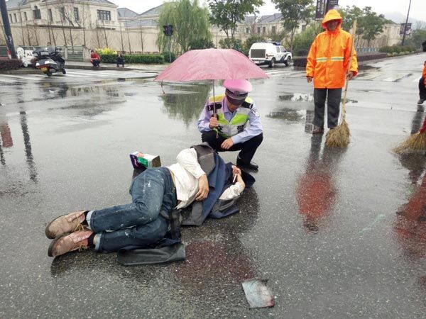 环卫工人和交警轮流为男子撑伞,冰冷事故中多了一份温情。