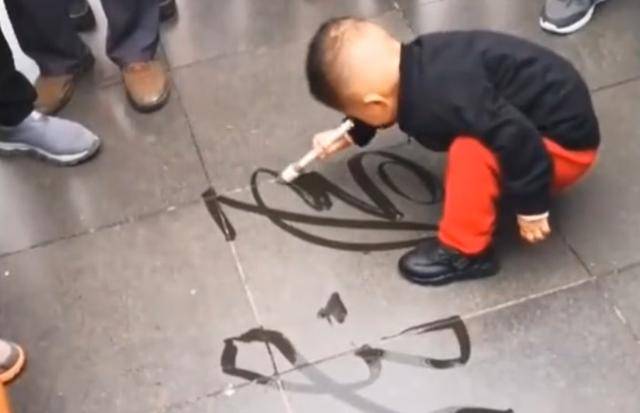 3岁的小孩跟着爷爷在广场练字,这笔锋大人都做不到。