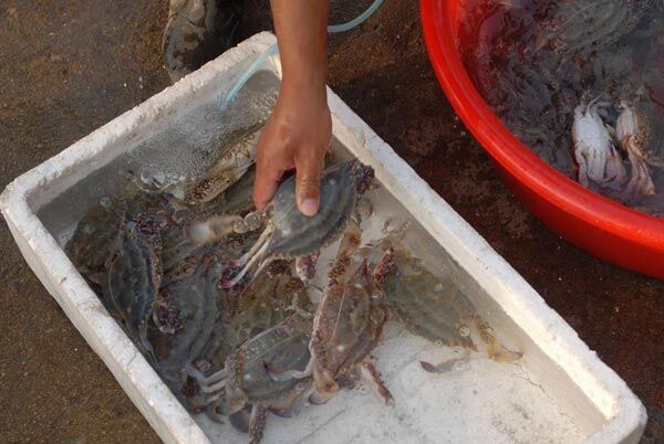 螃蟹价格亲民,图为商贩在销售低价螃蟹。
