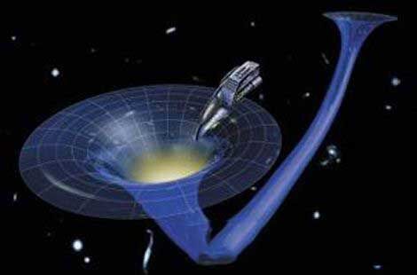 让我们换一个话题来谈谈科学幻想。物理学家们也一直在思考时间隧道的问题,但切入的角度完全不同,我们想知道的是通往过去或是未来的通道是否能在自然法则下存在。思考的结果是,我们认为有这个可能,而且,我们甚至给它起了个名字——虫洞。