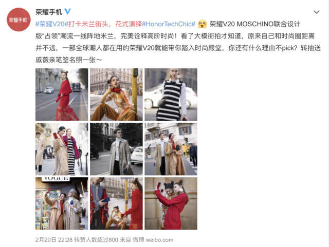 与之对应的是,荣耀手机的一系列和时尚相关的动作:官微发布了一组模特携带荣耀V20打卡米兰街头的时尚街拍;戚薇、林彦俊两位当红艺人穿戴多款荣耀与潮牌联合设计单品演绎高阶潮流;荣耀手机在微博上发起的VV Pig创意设计大赛,掀起了一股全民玩转HONORTechChic的热潮……