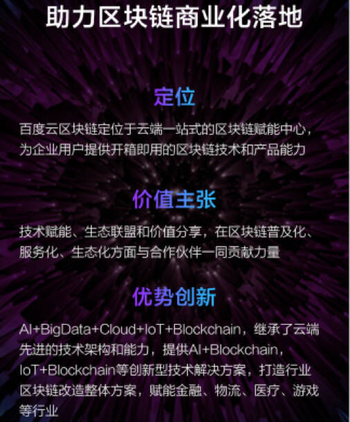 区块链作为去中心化的技术机制拥有广泛的应用场景与市场潜能。自2017年爆发式增长后,区块链虽然已经进入平稳期,但仍然存在概念混淆、技术性能制约、智能合约制约、共识机制、网络建设等痛点。为了打破行业壁垒,更快地将区块链投入实际业务场景,打造基于去中心化理念的业务实践,百度云和百度区块链实验室基于百度自研XuperChain技术内核,突破共识机制、单机计算和串行处理三大技术瓶颈,并融合ABC与IoT等能力,打造覆盖技术框架、产品体系、生态建设和行业落地实践的区块链商业化解决方案。
