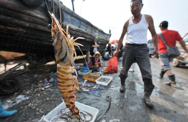 10月17日,山东青岛,进入秋季捕捞季节,姜戈庄的渔民赶海出船。秋季海捕获丰收,虾蟹变抢手货,图为市民展示青岛大对虾。