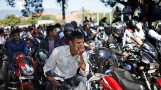 资料图:加德满都某加油站外排队等候加油的摩托车长龙