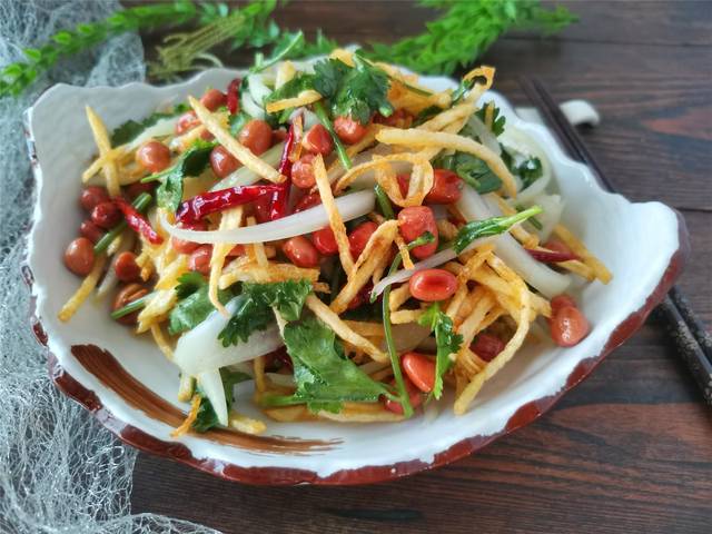 【三丝爆豆】所需材料:土豆1-2个、洋葱半个、香菜3-4棵、花生米1小碗、油盐适量、香油1汤匙、白糖1汤匙、米醋2汤匙、