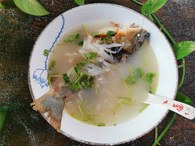 【鲫鱼萝卜丝汤】所需材料:鲫鱼1条、白萝卜半根、香菜1棵、油盐适量、葱1段、姜2片、