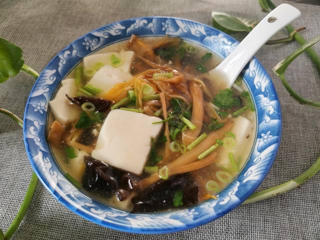 今天分享一款素食汤-什锦豆腐羹,常言道“饭前先喝汤,胜过良药方”。很多人很爱吃豆腐,因为它外观又白又嫩。尝起来鲜美可口,更重要的是它所富含的微量元素还有维生素氨基酸都很丰富,补钙作用也很好,可以促进人的新陈代谢和生长发育。这道汤羹食材也很丰富,又添加了黑木耳和黄花菜,营养变得更加丰富,木耳营养丰富,被誉为“菌中之冠”。木耳还具有滋补润燥、养血益胃的好处。非常适合秋季吃的食材。