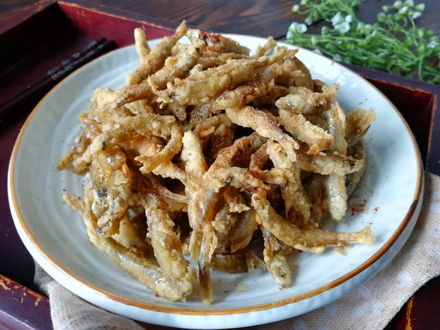 【干炸鱼】所需材料:黄瓜香鱼250克、油盐适量、葱1段、姜1块、五香粉1茶匙、料酒1\2汤匙、淀粉2汤匙、面粉2汤匙、