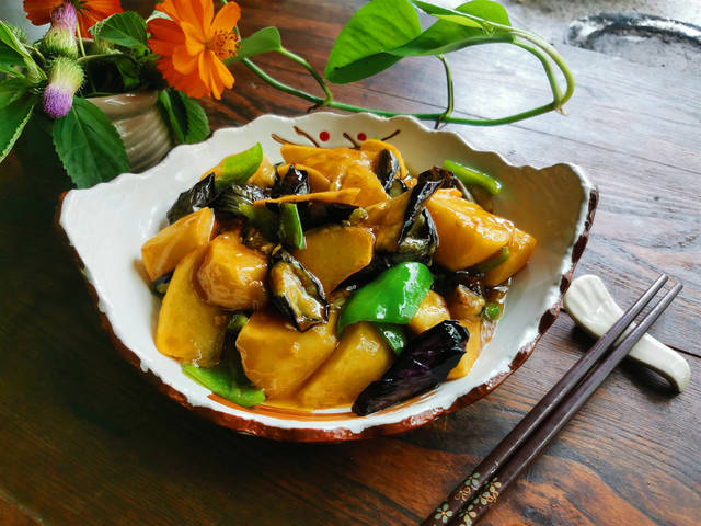 这道菜肴最常见的做法就是将三样食材过油炸制,觉得油腻,吃起来有负担。为了健康着想,还是要努力将油分降至最少,又能保留其风味。有些做法为了少油,食材不经过油炸,改变了原来的做法,做出的地三鲜,根本不是原来的味道。怎样把这道菜肴做的好吃还少油,教你在家做东北地三鲜,茄子极易吸油,因此炸茄子时,别着急把茄子直接下锅炸,教你小窍门,少油吃着不油腻。下面看看我是怎样做的这道菜肴。