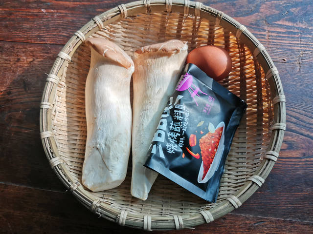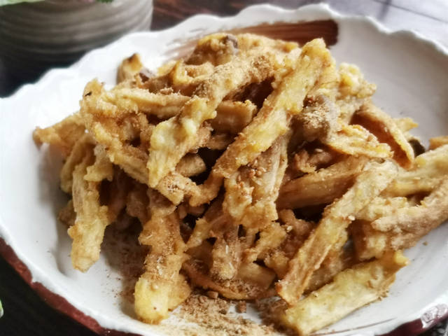 【干炸杏鲍菇】所需材料:杏鲍菇2个、鸡蛋1个、油盐适量、白胡椒粉1茶匙、烧烤蘸料1汤匙、淀粉3汤匙、