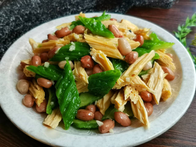 苦瓜的做法很多,苦瓜最好的吃法还是凉拌。凉拌能够很好地保留苦瓜中所含有的维生素。吃着也清淡,口感脆嫩,今天分享的这道凉拌菜肴的做法,是和腐竹,花生米一起拌制而成,花生米水煮后在拌,吃着不上火,腐竹可以补充身体所需的蛋白质和矿物质,钙质等,菜肴拌好后,椒香味浓,清凉脆嫩可口,是夏季一道不错的养生解暑小菜,下面一起看看这道菜肴是怎样做的: