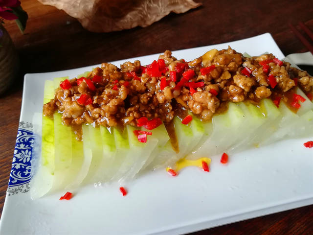 【肉末蒸冬瓜】材料:冬瓜500克、猪肉100克、红辣椒1段、油盐适量、葱1段、姜2片、大蒜1瓣、蚝油1汤匙、料酒1/2汤匙、生抽2汤匙、水淀粉适量、