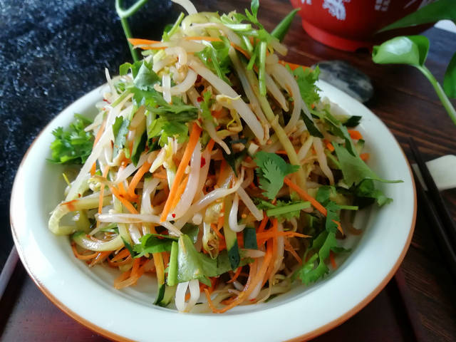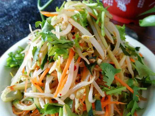 夏季天气炎热,喜欢吃凉拌的菜肴,开胃爽口,这道夏季必学凉拌小菜,几块钱就能拌一盘,食材由黄瓜和绿豆芽一起拌制而成,绿豆芽口感好,营养丰富。绿豆芽极富脆性,含有丰富的VC,绿豆芽不仅能清暑热、解毒,利湿热,还能降血脂和软化血管。价格也便宜,二三块钱一斤,经济又实惠,黄瓜是夏季经常食用的蔬菜,清香脆嫩,具有除热,利水利尿,清热解毒的好处,还有减肥的作用。这道凉拌菜做法简单,吃着脆嫩爽口,开胃,下酒下饭都不错,是一道夏季必学凉拌小菜,天热吃它清热去火,下面分享下做法: