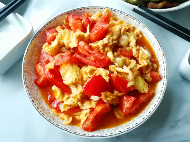【西红柿炒鸡蛋】这个是最家常的一道菜了,几乎家家都会做这道菜肴,百吃不腻,味道是酸酸甜甜的,是很多小孩子的心头爱,酸甜开胃,把汤汁拌着米饭一起吃,也会吃得津津有味。如果想要把这个菜炒得好吃,西红柿和鸡蛋的比例其实也是很重要的,西红柿太少,炒出来的西红柿鸡蛋可能就比较干,也会让鸡蛋特别干涩油腻,所以西红柿和鸡蛋的比例应该1:1的比例最好。做这道菜的时候加入一些白糖进去,加入白糖主要是为了能够中和西红柿的酸味,而且也可以提升鲜味,会让这道菜的口感更加好吃一些。