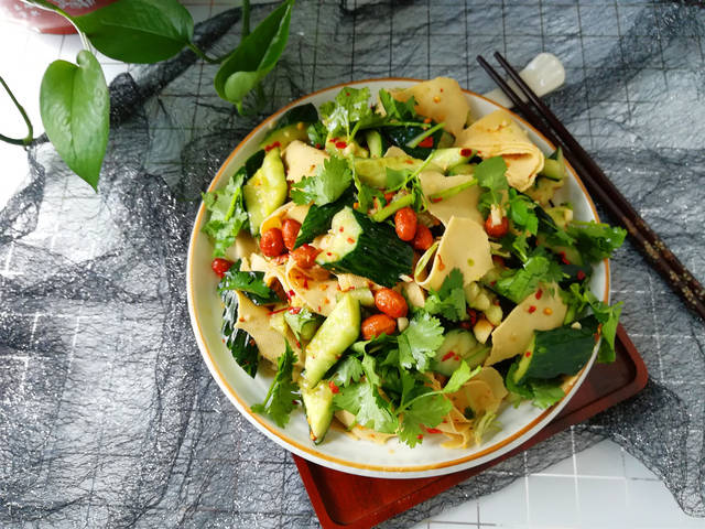夏季,天气炎热,很容易让人没有了胃口,就想吃些清淡凉爽的菜肴,凉拌菜在夏季最受欢迎,分享一道适合夏季的凉拌菜,天热,最爱吃这个凉拌菜,对这个菜情有独钟,这道凉拌菜是用黄瓜、豆皮和花生米一起拌制而成,黄瓜富含多种维生素,如B族维生素、维生素C等。清香味浓,具有独特的清香味道,夏季吃它特别的开胃。夏季吃它有除热,利水利尿,清热解毒的好处。