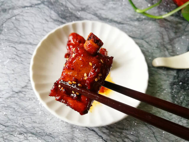 材料:猪肋排500克、油盐适量、葱1段、姜2片、花椒10粒、大料1个、料酒1汤匙、冰糖3汤匙、香醋3汤匙、红烧酱油半汤匙、芝麻适量、