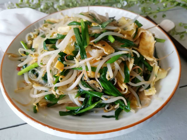 材料:绿豆芽250克、鸡蛋2个、韭菜1把、粉丝1把、油盐适量、姜2片、米醋几滴、生抽1汤匙、