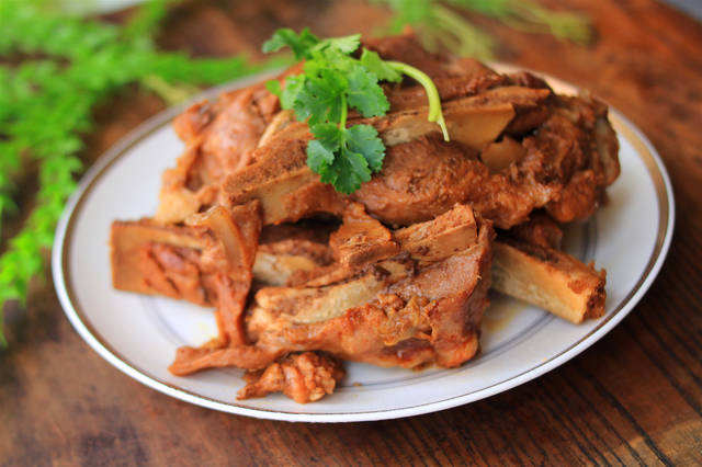 【酱骨头】 材料:猪脊骨、盐、葱、姜、花椒、大料、桂皮、香叶、十三香、料酒、白糖、生抽、红烧酱油、干黄酱、鸡精、 1. 将大块猪脊骨略洗,置大盆中加满清水浸泡几个小时,中间可换水数次,去除猪骨的血水,为了使酱好的骨头味道浓厚,建议一次酱的肉骨头不要太少, 2. 将泡净血水的脊骨冲洗数遍后置大锅中加水没过猪骨,加生姜数块(拍破),葱数根打结,八角(大料)几颗,花椒一小把,桂皮一小块,香叶2片,十三香少许,料酒,红烧酱油,生抽酱油,炒好的糖色,白糖,干黄酱。 3. 大火烧至汤开后打净浮末,加精盐适量(卤汁需较咸才能使酱好的骨头充分入味,故用盐量较大),转中小火加盖焖煮约1小时。 4. 加鸡精适量,转中—大火敞盖炖约30分钟 (目的是将汤汁略收,使肉骨头进一步入味)后即可。 5.酱骨头剩下的肉汤是做 卤鸡蛋 、 熏鸡蛋 、卤豆腐皮、卤豆腐干和虎皮蛋的好汤料。