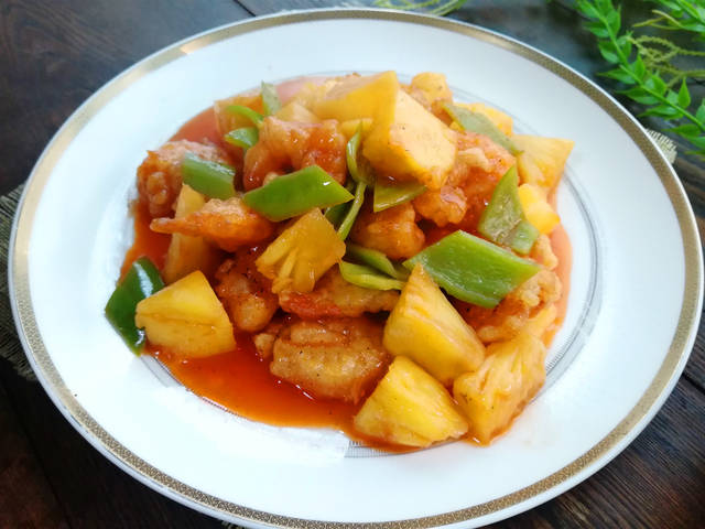 材料:大虾250克、菠萝1/2个、尖椒1个、油盐适量、番茄酱2汤匙、白糖1汤匙、米醋2汤匙、料酒1/2汤匙、白胡椒粉1/2茶匙、淀粉3汤匙、