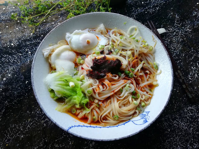 材料:挂面1把、鸡蛋2个、白菜叶2片、绿豆芽适量、香油1汤匙、盐适量、葱1段、鸡精1茶匙、陈醋1汤匙、生抽1汤匙、老干妈1汤匙、