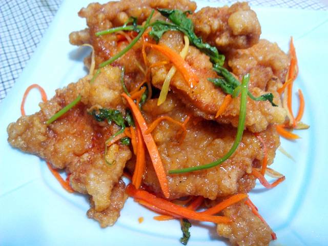 【锅包肉】这道菜肴是将猪里脊肉切片腌入味,裹上淀粉,下锅炸至金黄色捞起,再下锅烹制而成,色泽金黄,口味酸甜。