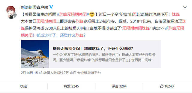 近日,一篇名为《珠峰景区被永久关闭》的图片在网络上疯传。消息称,由于垃圾太多,珠峰将面临无限期关闭。短时间内登上各大资讯平台热搜榜,成为人们热切关注必激烈讨论的话题。