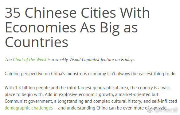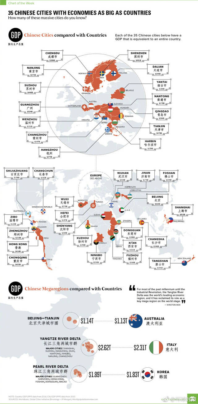 近日,美国数据平台视觉资本(Visual Capitalist)用图表的形式说明,中国已有35个城市达到了“富可敌国”的水平。在2015年,包括北上广、深圳、天津以及苏州等在内的35个中国城市GDP分别相当于35个国家的GDP。