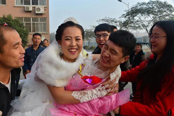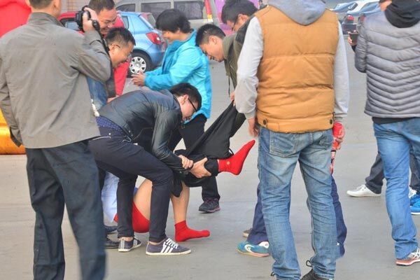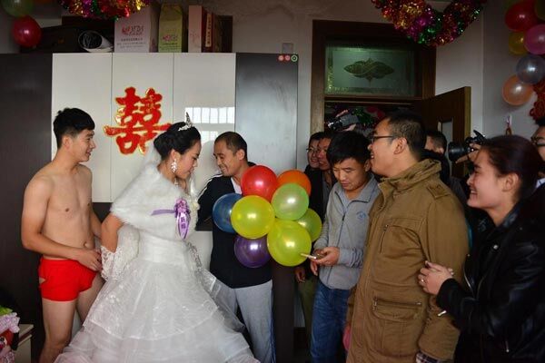 2015年10月24日,在山东省聊城一家属区惊现裸体新郎迎娶新娘场面,早晨6点15分,新郎被同学同事高兴地扒掉外衣,只剩一条红色的裤头,当时气温是9摄氏度,尽管天气较寒冷,但热闹气氛不减。