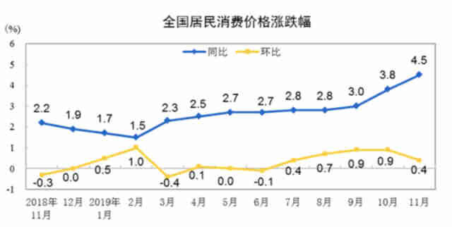 今天(12月10日),国家统计局公布2019年11月份全国居民消费价格(CPI),根据数据,11月份CPI上涨4.5%,远高于9月份的3%,同时也创下2012年1月份以来新高。