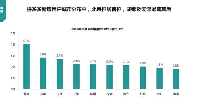 据数据显示,2018年拼多多用户增长最多的地区就是北京,而在增长TOP10中,北京、广州、深圳、成都、武汉等一线和新一线城市全部没有缺席。