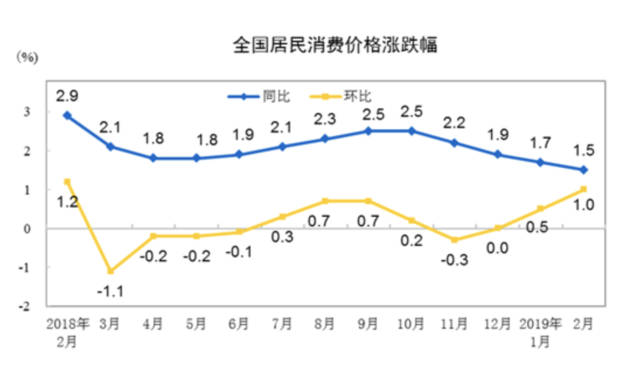 1、2019年2月份,全国居民消费价格同比上涨1.5%,这是CPI连续4个月下跌了。