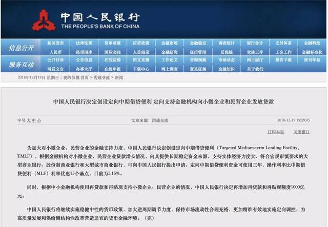 12月19日晚上8点,央行宣布:创设定向中期借贷便利定向支持小微和民营企业!