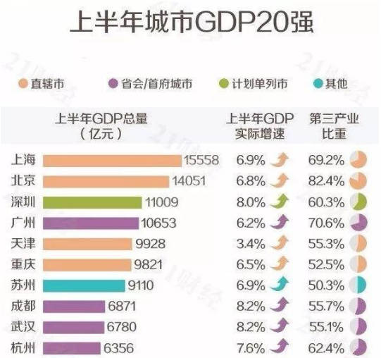 根据统计局的数据显示,截至2018年上半年,国内经济总量前十的城市分别是:北京、上海、广州、深圳、天津、重庆、苏州、成都、武汉和杭州。总体来看,可分为两个梯队:一线北上广深,准一线后面6个。