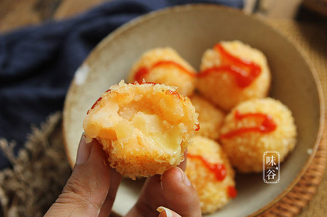 制作过程是非常的简单,土豆泥包入芝士碎,浓郁的芝士碎和土豆的完美融合,色泽金黄的外壳,咬一口下去糯软的土豆混合着满满的拉丝的芝士喷涌而出,充斥整个口腔,好吃到停不下来。我家小孩子一口一个,一大盘一下子就消灭了,吵着天天让我做给他吃。家里有小朋友的亲,可以试试看,他们肯定非常喜欢的!