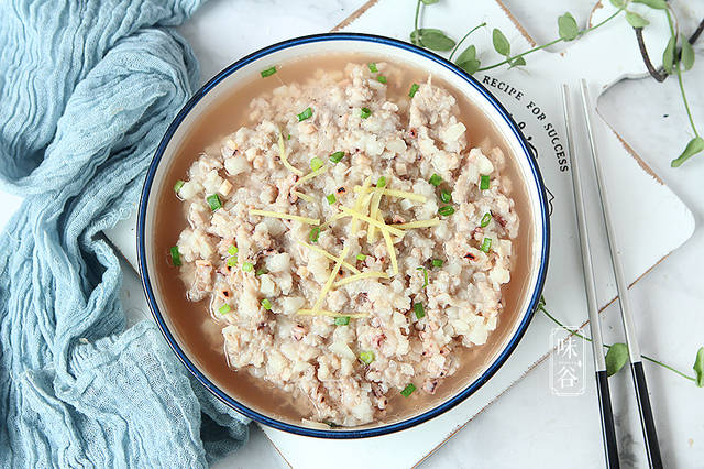【材料】:猪肉(三分肥七分瘦) 500克、咸墨鱼 2个、马蹄(荸荠) 5个、姜丝 少许