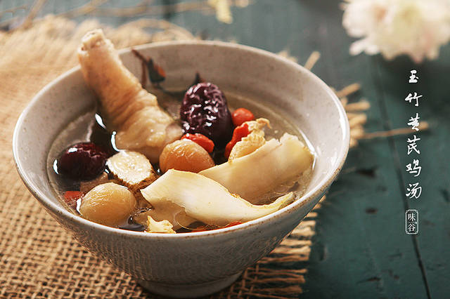 【材料】:鸡肉 半只、黄芪 10克、玉竹 15克、桂圆 8克、红枣 6颗、枸杞 1把、姜 2片、盐 适量