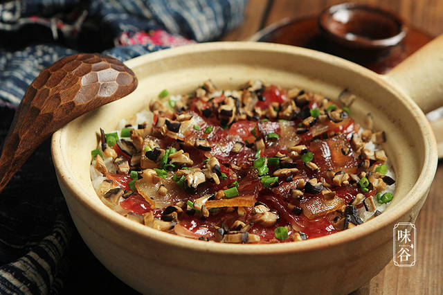 腊味与米饭是公认的天作CP了,对于传统的广东家庭来说,没有什么比在家煮一锅腊味饭更来得和暖温馨了,它是源于广东地区的特色美食。正宗的广式腊味饭以瓦煲为盛器,把淘好的米放入煲中,量好水量,加盖,把米饭煲至七成熟时加入配料,再转慢火煲熟,腊肉腊肠的油脂与些许肉汁渗透到下层的米饭当中,令米饭更加甘香可口。寒冷的天气里,打开盛满腊肉、腊肠的煲仔饭,饭香与肉香扑面而来,两者融合得天衣无缝。