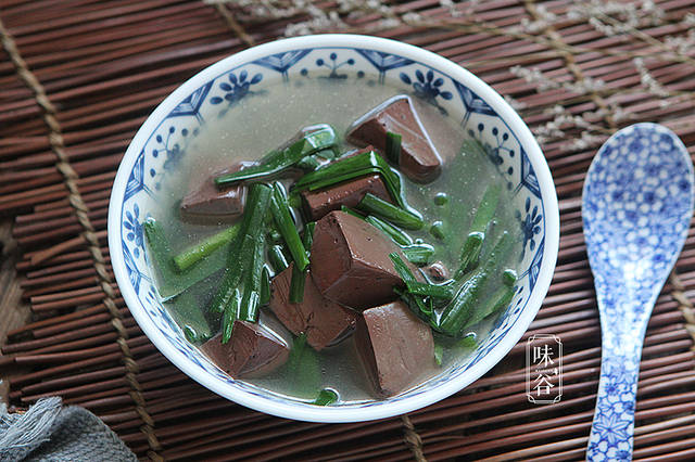 韭菜猪红汤,广东人甚是喜欢的一道简单食品。下至街边小店,上至高档酒楼,都可以见到它的身影。猪红与韭菜两者搭配起来营养丰富,做起来简单方便,只要白胡椒和盐调味,自己做这样一大碗韭菜猪红汤不过5块钱,去尘清肺、美容补血,实属物美价廉的食疗佳肴!