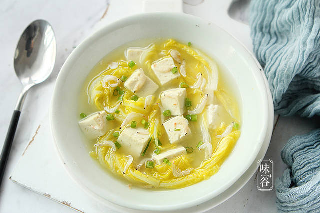 现在也正是白菜收获的季节,作为冬季的时令蔬菜,白菜虽然价格低廉,但食用价值却是不容小觑的。白菜中的膳食纤维含量十分丰富,含水量也很充足,冬天多吃大白菜能在满足身体所需营养的同时,还能润肠通便,快速为机体补充水分,从而起到滋阴润燥、润泽肌肤的作用。而且白菜和豆腐还是营养丰富又可以瘦身的菜。这种做法特别简单,十几分钟搞定,调味也只有盐,看上去的清汤寡水,但是因为加入虾米,滋味不错呦,既保有美味,而且还低脂减肥,不像其他汤那么油腻。