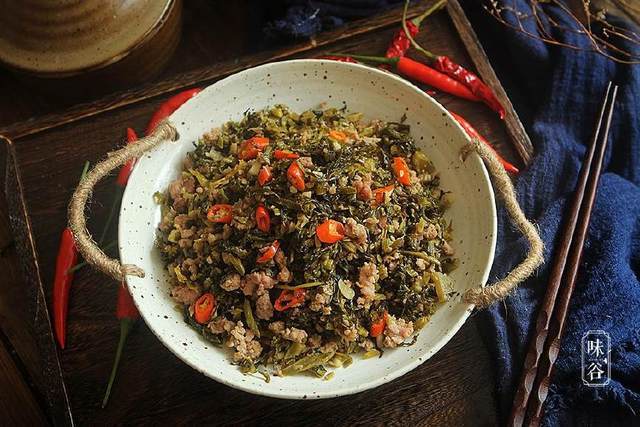 【材料】:雪菜 100克、猪肉 100克、小米椒 6条、蒜末 适量、酱油 1勺、盐 适量