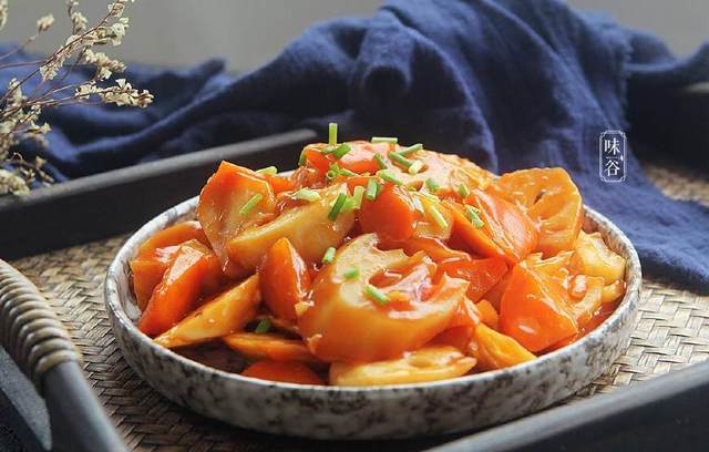 【材料】:胡萝卜1根、莲藕 1大节、蒜 3瓣、姜 2片、酱油2勺、白糖 3勺、白醋 3勺、番茄酱 3勺、淀粉 2勺、