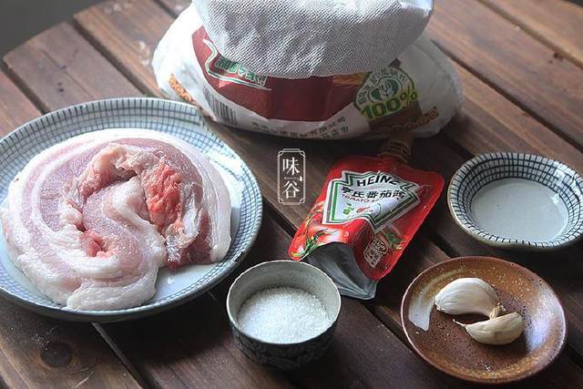 【材料】:五花肉 500克、番茄酱 适量、面粉 适量、白砂糖 2大匙、蒜 3瓣、醋 2大匙、盐 2小匙、酱油 1大匙