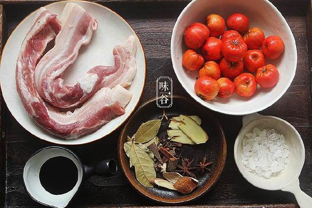 【材料】:五花肉 500克、山楂190克、冰糖30克、姜 2片、蒜2瓣、(香叶、八角、桂皮、草果)少许、料酒 2勺、老抽 2勺、盐 1小勺、